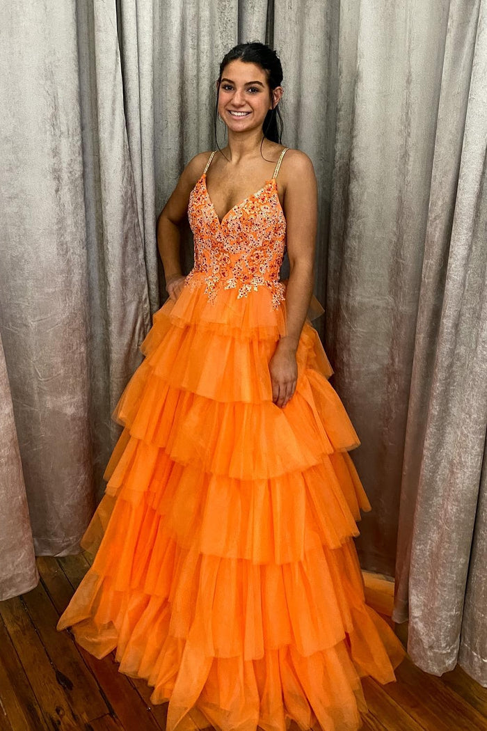 Orange V-Neck High-Waist Tiered A-Line Prom Gown