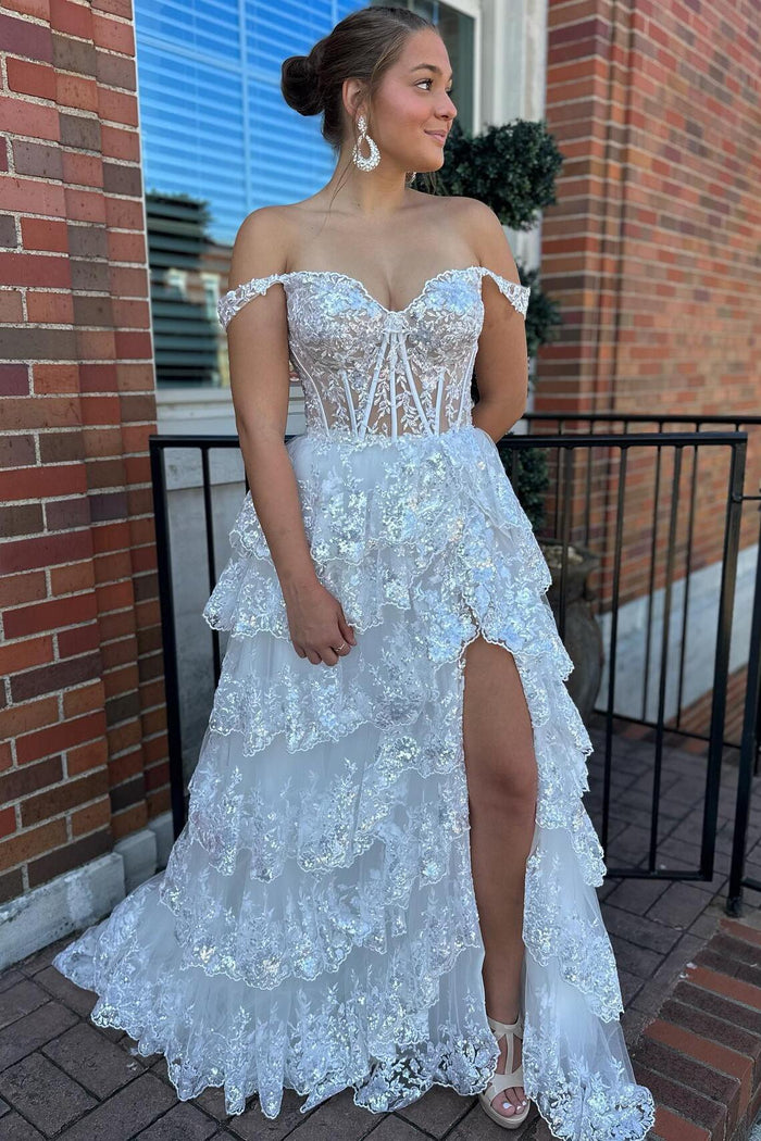 White Off-Shoulder Beaded Ruffled Layers Long Prom Dress