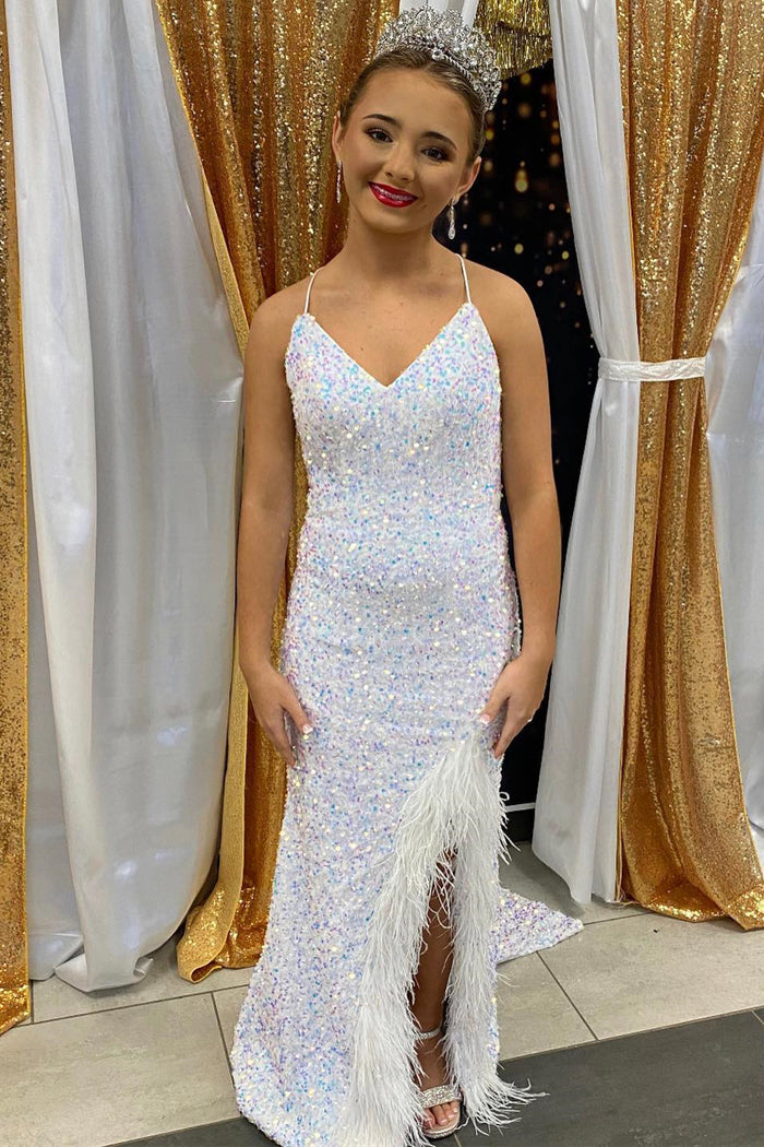 White Mermaid Iridescent Sequin Lace-Up Long Prom Dress with Slit