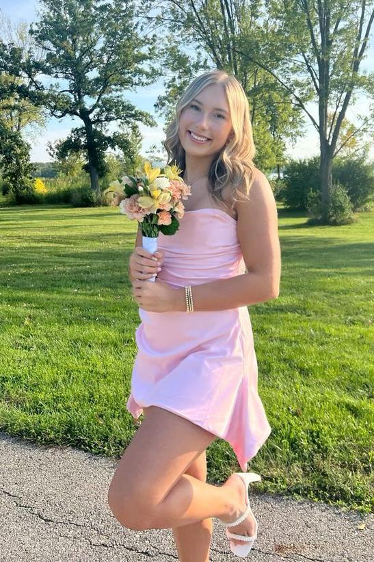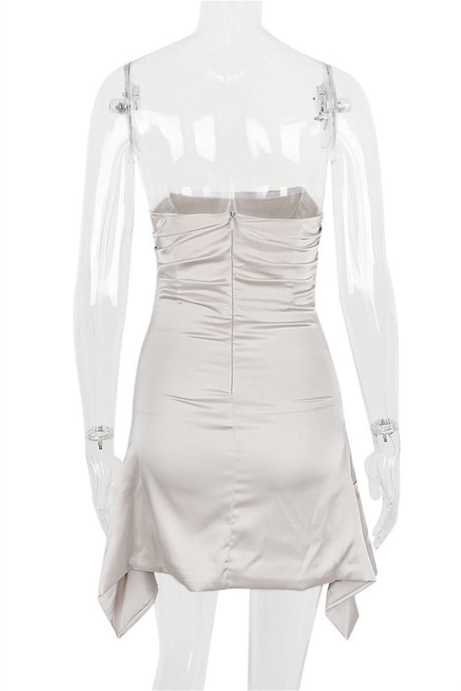 Expertly crafted with high-quality satin material and a sleek strapless design, this aqua A-line dress exudes elegance and refinement. The irregular hem adds a touch of modern style, while the zip-up back ensures a secure and comfortable fit. With its above knee length and easy care instructions, this dress is the perfect choice for any occasion.