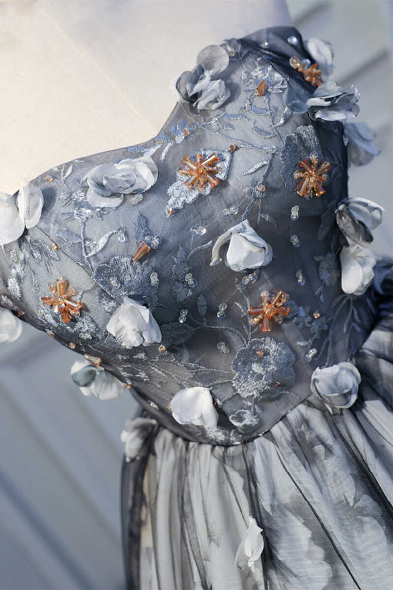 Navy blue short homecoming dress features strapless sweetheart neckline, 3D flowers embellishments, lace-up back and multi-layer skirt.