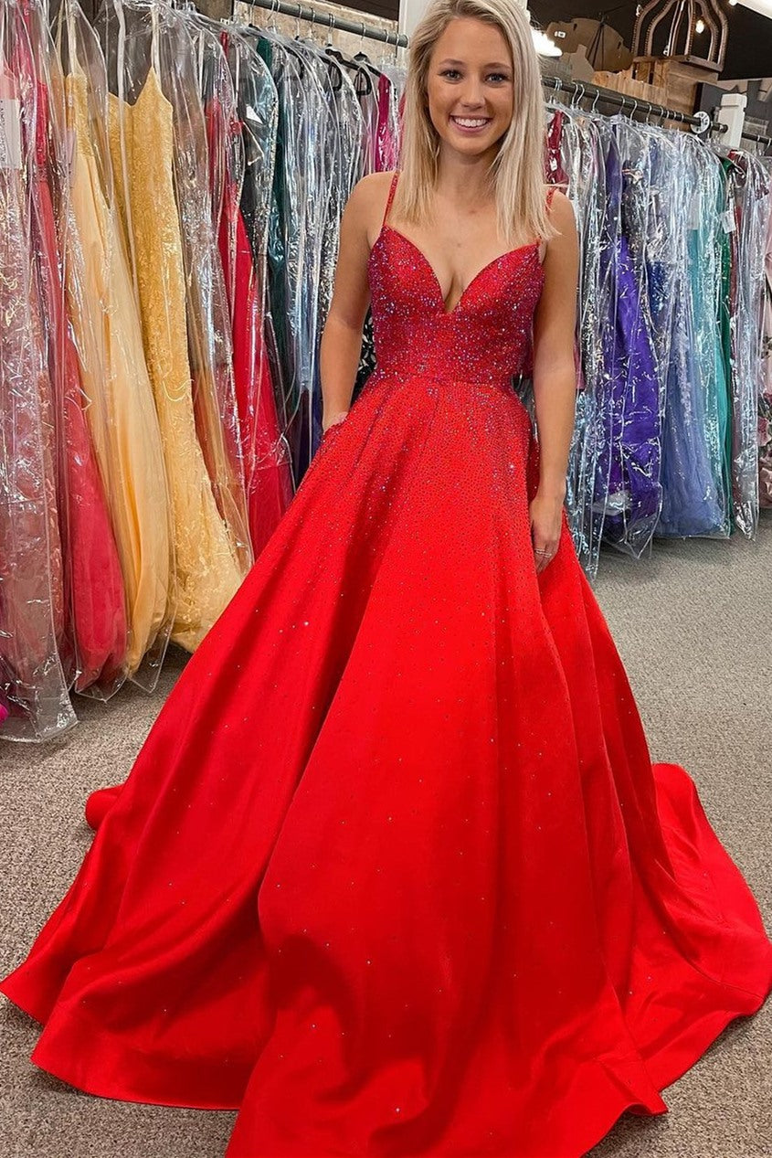Elegant red A-line long formal dress features spaghetti straps, beads, pockets inside and lace up back.
