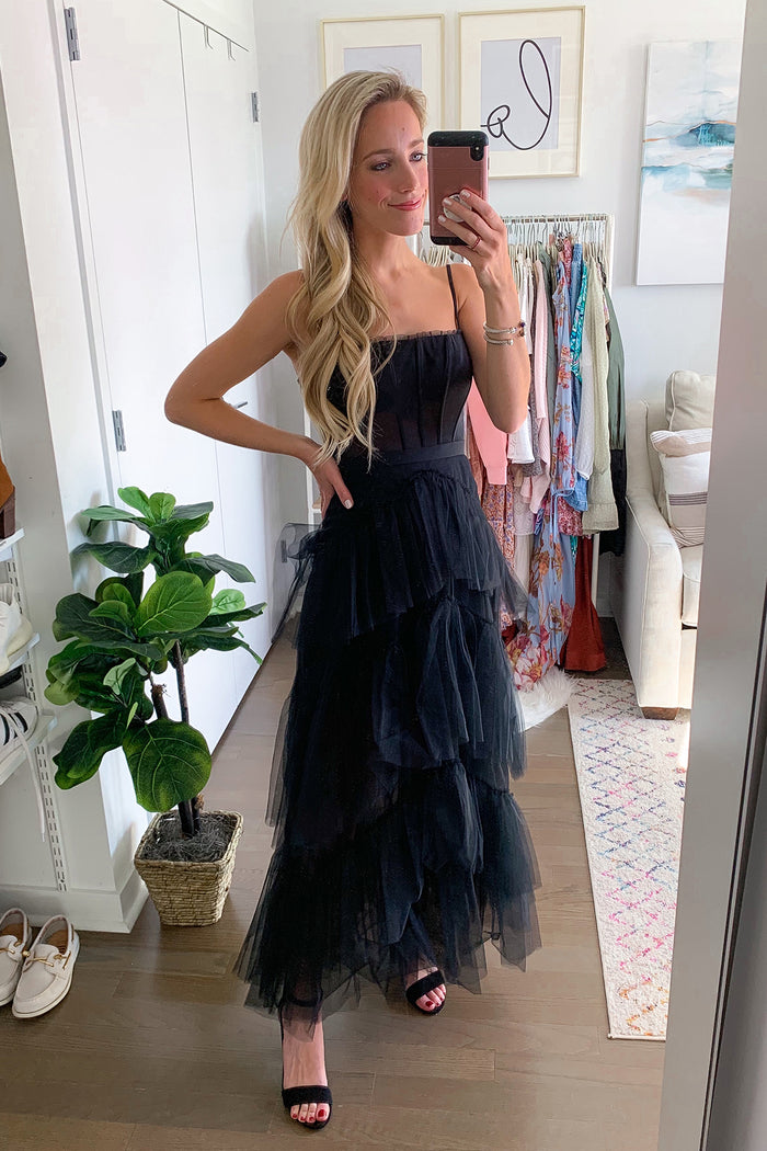 Black Strapless A-line Appliques Tulle Long Prom Dress