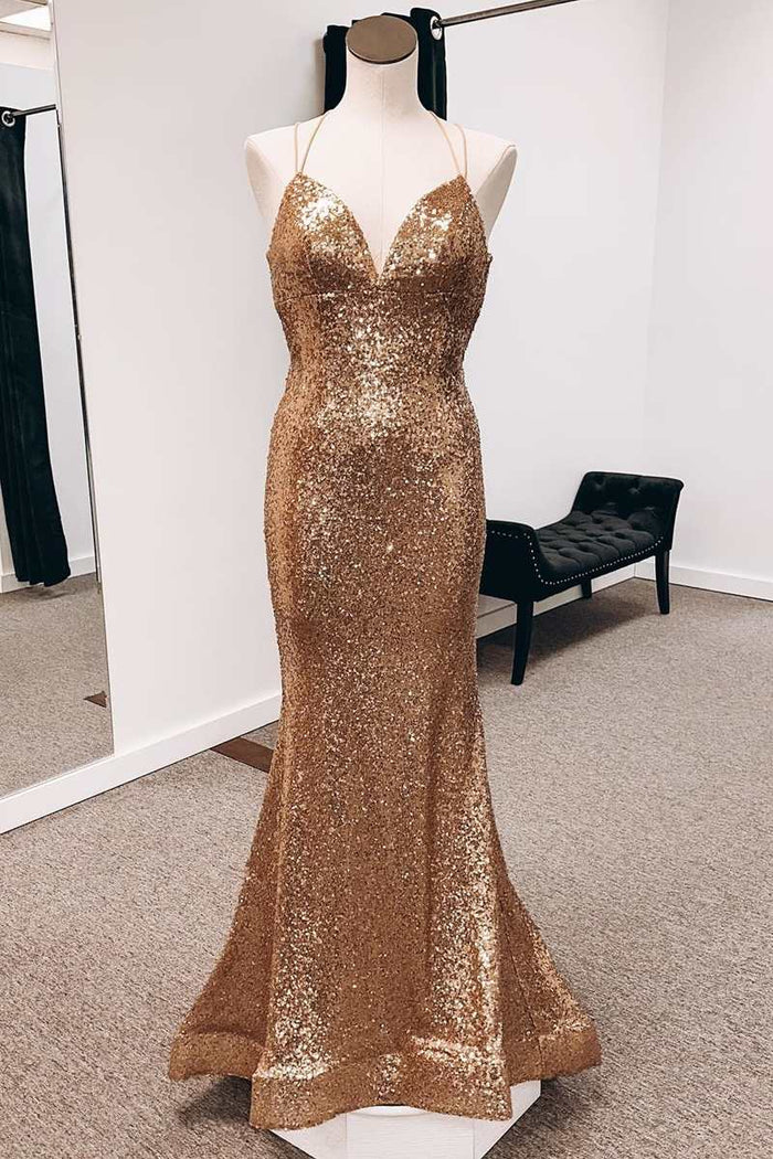 Champagne Sequin Cowl Back Mermaid Long Prom Dress with Slit