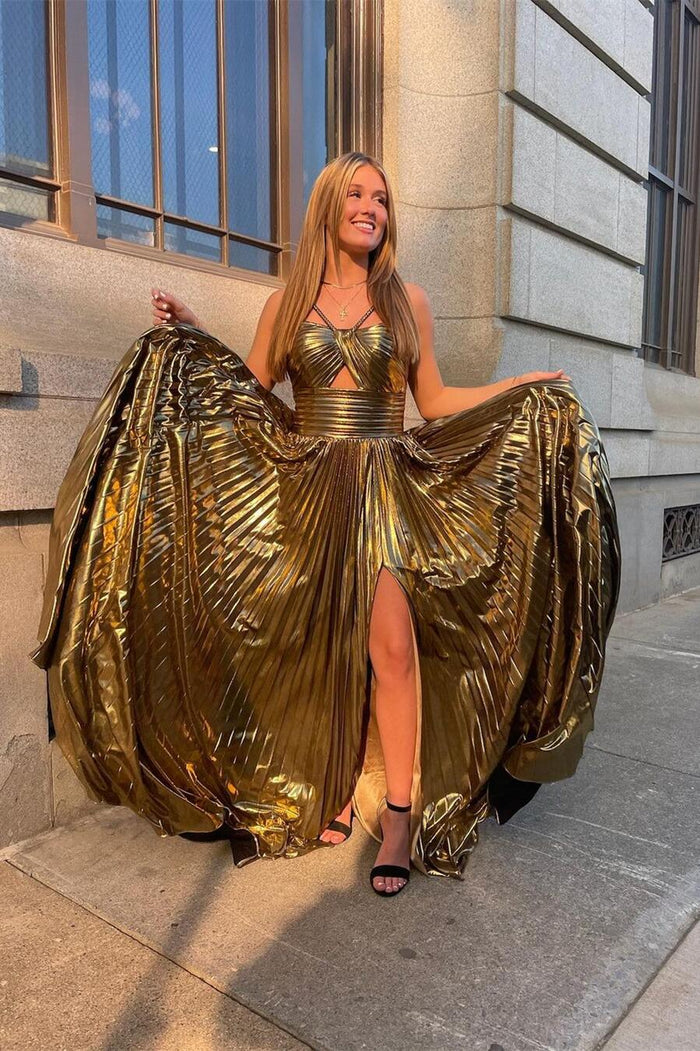Bow Straps Gold Metallic A-line Long Formal Dress