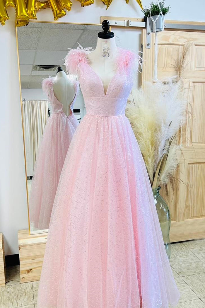Glitter Feathers V-Neck Empire Waist A-Line Prom Gown