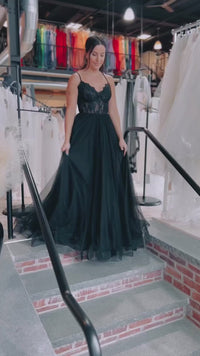 Black Tulle Lace Lace-Up Back A-Line Prom Dress with Slit