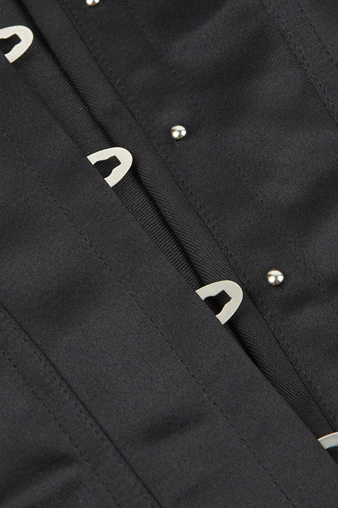 This black bustier corset top features ruffled puff sleeves, ruffled neckline, and a lace-up on the back.