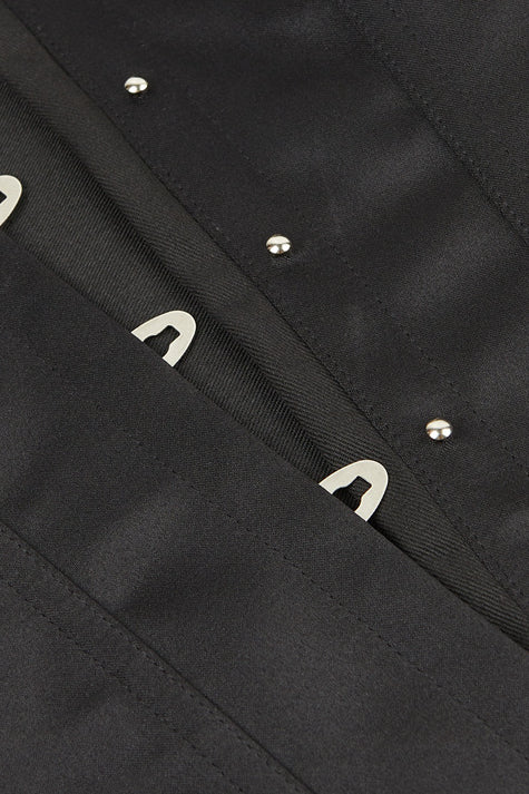 This black bustier corset top features a ruffled off-the-shoulder neckline with illusion long sleeves, steel boning inside, and a lace-up closure on the back.