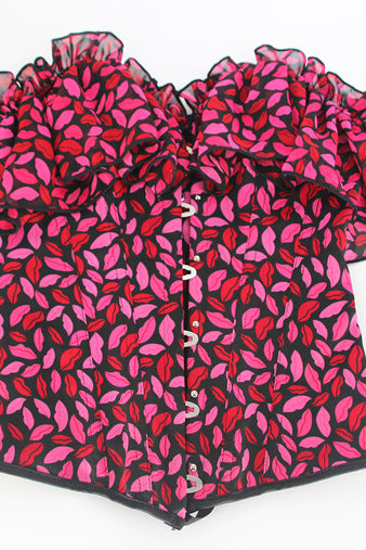 Red Lips Prints Ruffled Off-the-Shoulder Lace-Up Bustier Corset Top