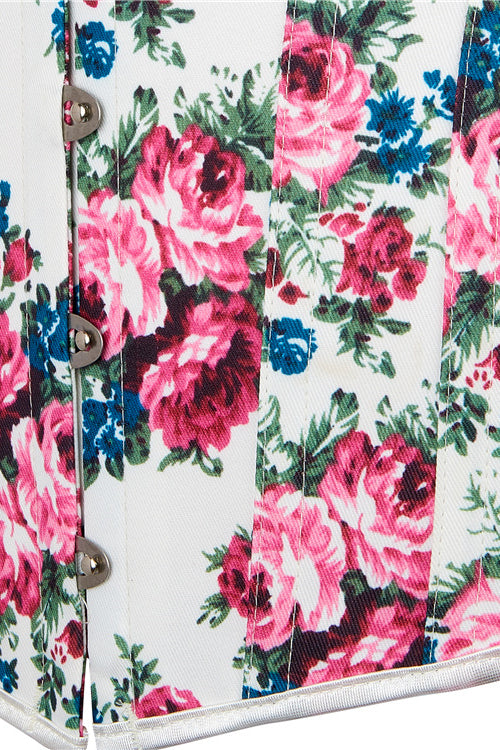 This white bustier corset top features a sweetheart strapless neckline, rose prints fabric, and a lace-up back detail.