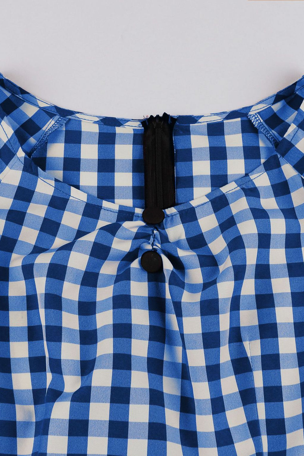 Women's vintage Halloween plaid dress features a round neckline with short sleeves, maid style, an A-line silhouette, and a black knee-length skirt with blue plaid ruffled hemline. Note: If you would like to make it a full skirt look, you need a petticoat to make it puffy. Go to our Accessories>Petticoats category to choose one.