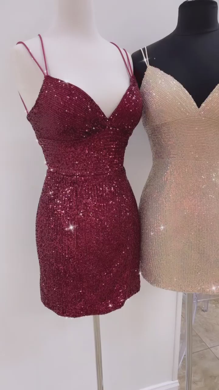 Navy blue short sequined homecoming dress features v neck and lace-up back.