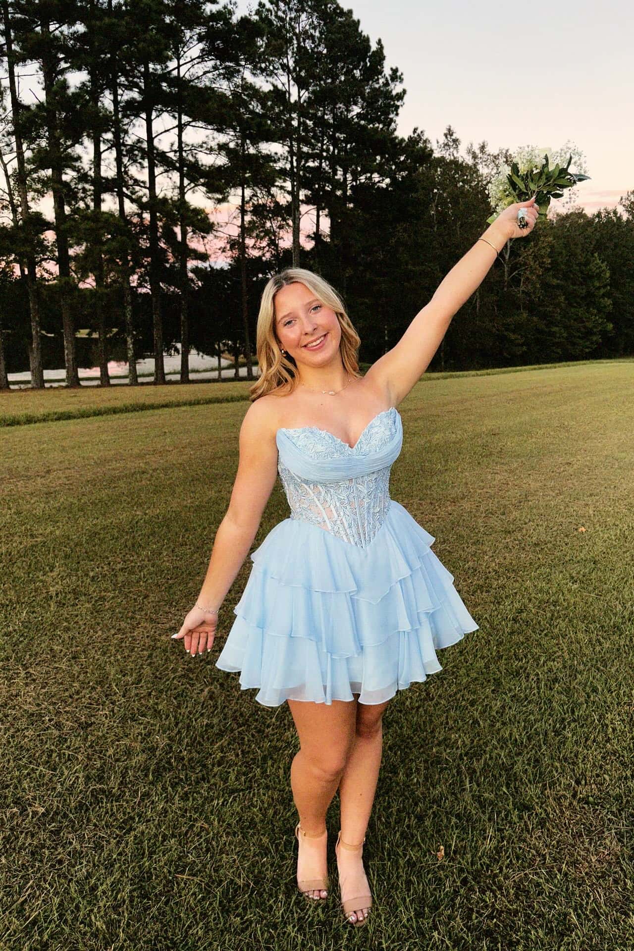 This above-the-knee dress features hot pink chiffon crafted into an A-line silhouette with a strapless neckline. The sheer appliquéd bodice is structured with boning, complemented by a tiered ruffle skirt and a lace-up back for an adjustable fit.