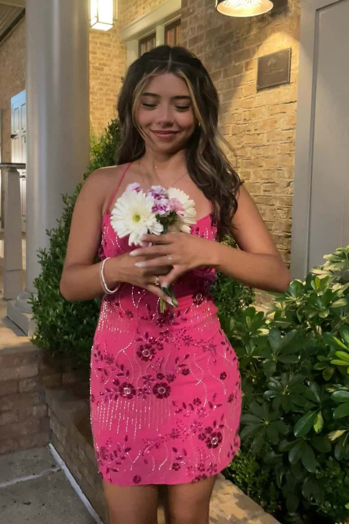 Fuchsia Appliques V Neck Lace-Up Sheath Homecoming Dress