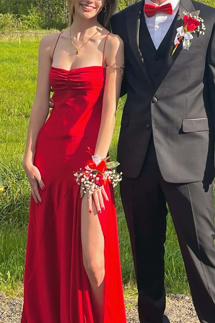 Spaghetti Straps Red Beaded Long Dress with Slit