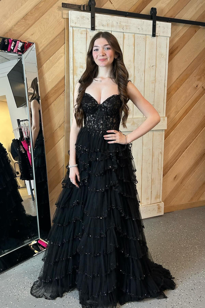 Black Off-the-Shoulder Ruffle Multi-Layers Long Prom Dress