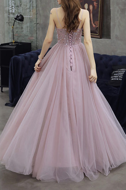 Elegant a-line pink long prom dress with spaghetti straps, lace up back and sequins.