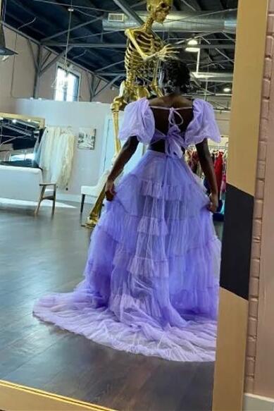 Dreamdressy this stunning style dress is designed with a corset bodice, featuring ruffled edging and intricate pleated detail with a bow tie closure on the back. Puff illusion sleeves offer an alluring look, and the floor-length skirt is layered with multiple tulle panels, creating a dramatic effect. The sophisticated ensemble is finished with a sultry leg slit.