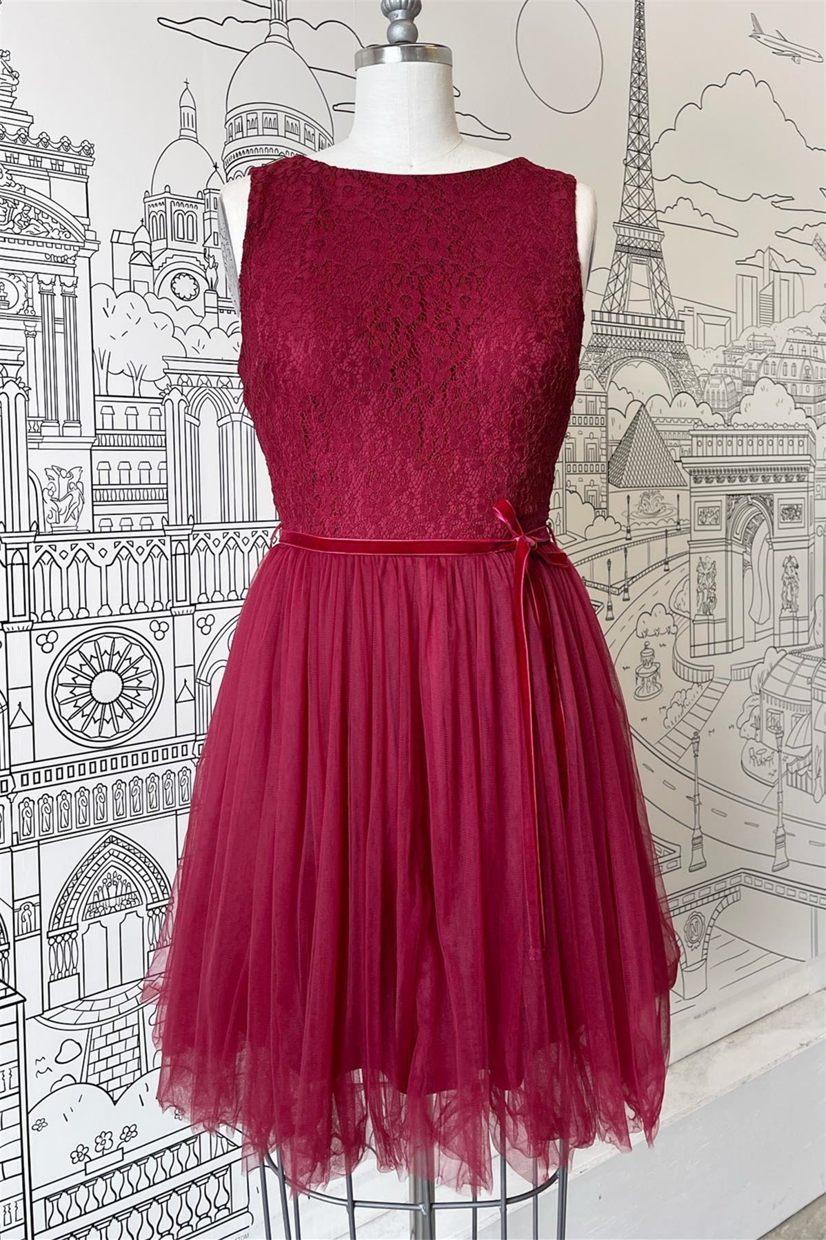 Dreamdressy this A-line silhouette mini dress features a scoop neckline without sleeves, a lace corset bodice, and a gathering skirt with a sash bow tie at the waist.