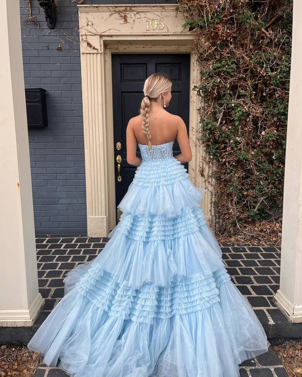 This fuchsia prom gown boasts an A-line silhouette, strapless sweetheart neckline, a sequined floral embroidered appliqued corset bodice, and a full-length skirt with multiple layers.