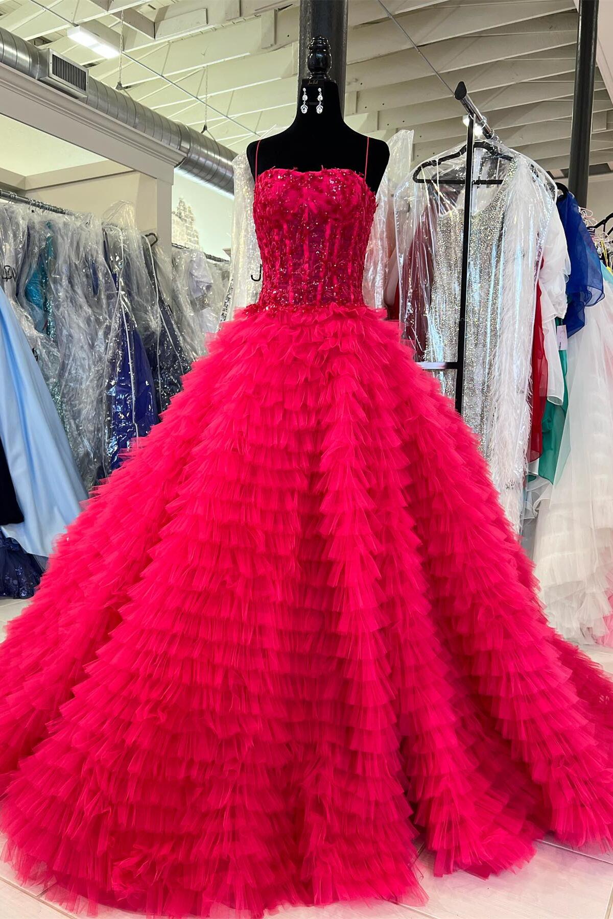 Elegant light blue long prom dress features spaghetti straps, side slit, tiered skirt and lace up back.