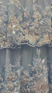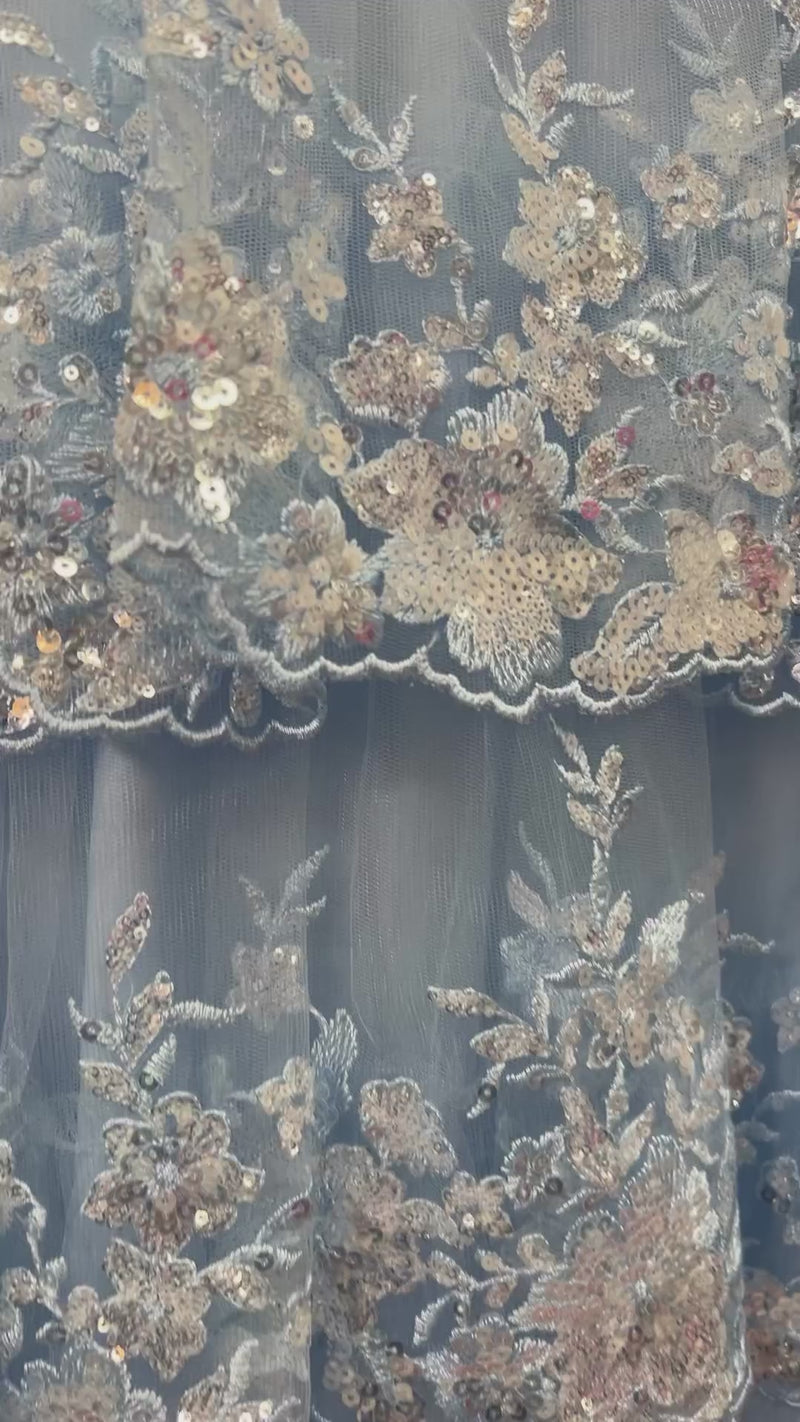 This style of prom dress features a V neckline on the front and back, spaghetti straps, a sheer corset bodice with sequined floral embroidered appliques, and a floor-length skirt with sequined multi-layers.