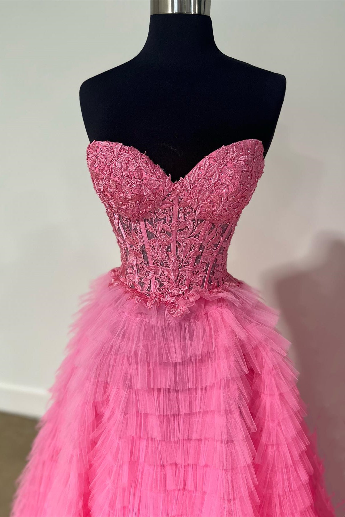 This yellow prom dress features a sweetheart strapless neckline, a sheer corset bodice with floral embroidered appliques, and a floor-length skirt with multi-layers.