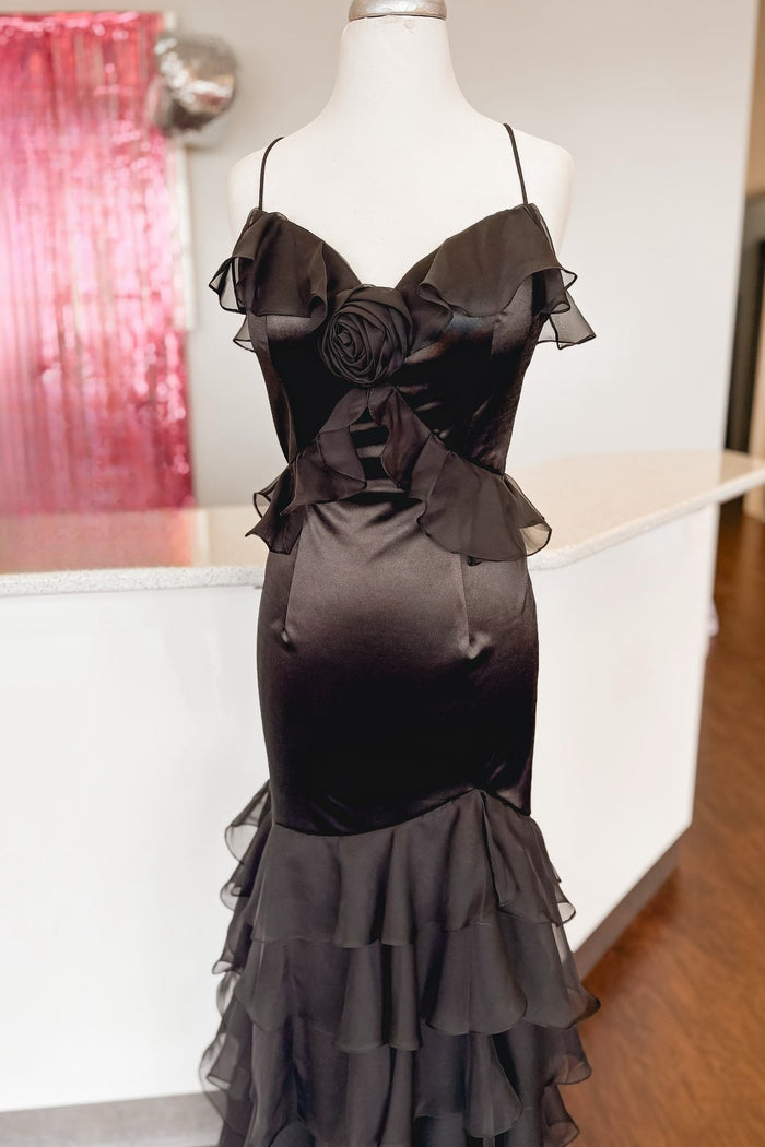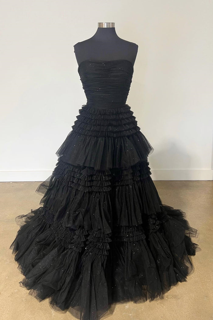 Black Tulle Strapless Belted Tiered Long Dress with Ruffles