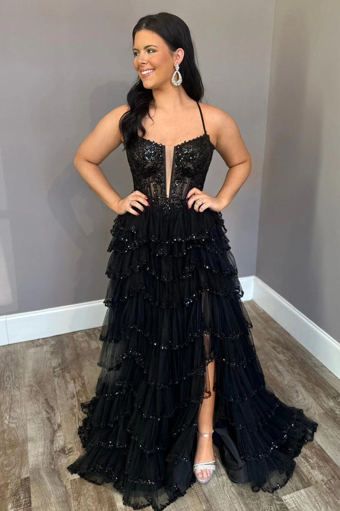 Black A-line Straps Multi-Layers Sequined Long Prom Dress with Slit