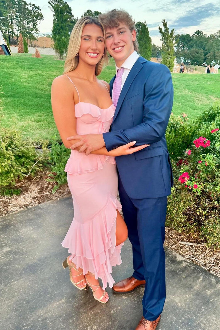 Spaghetti Straps Pink V Neck Ruffle Long Maxi Dress