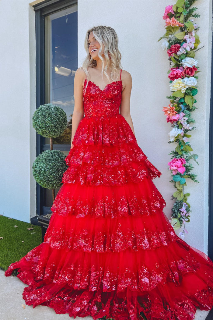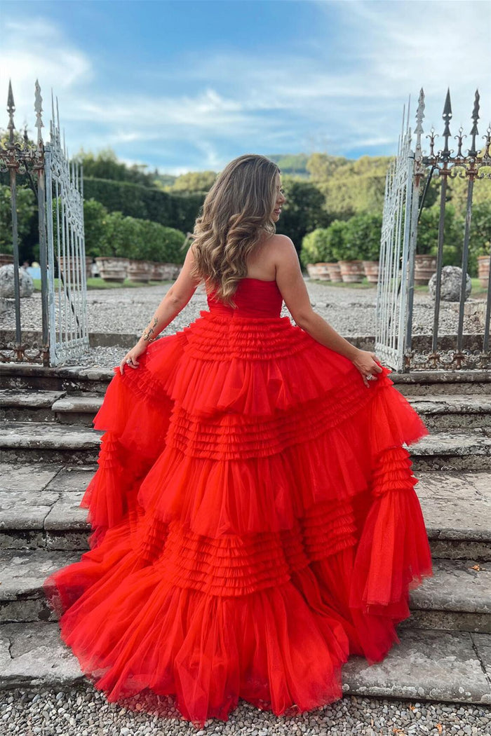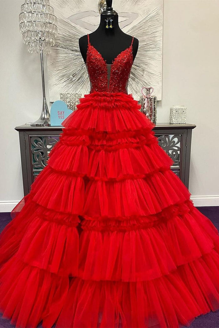 Red Layers A-line Plunging V Neck Long Prom Dress