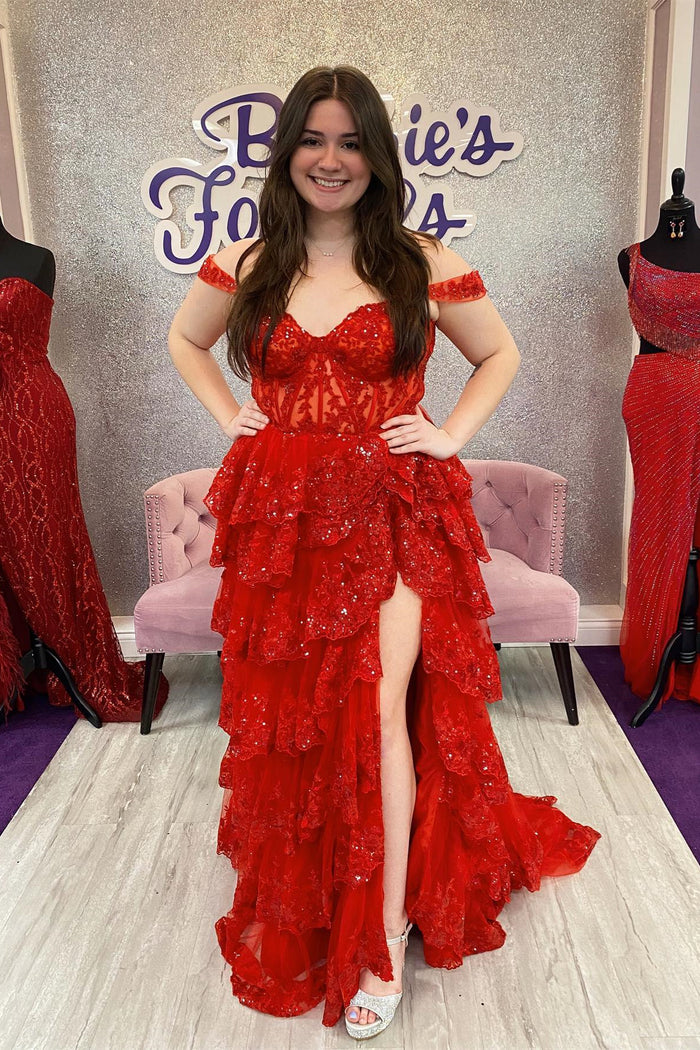 Red Off-the-Shoulder Layers Beaded Tulle Long Prom Dress