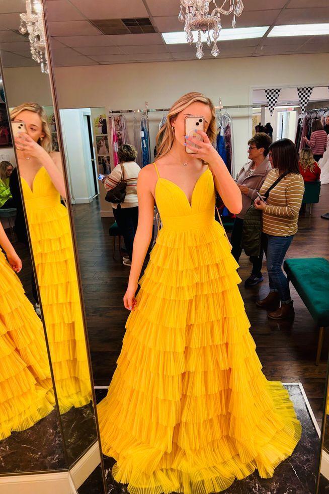 Spaghetti Straps Yellow Keyhole Tiered Ruffle Long Formal Dress