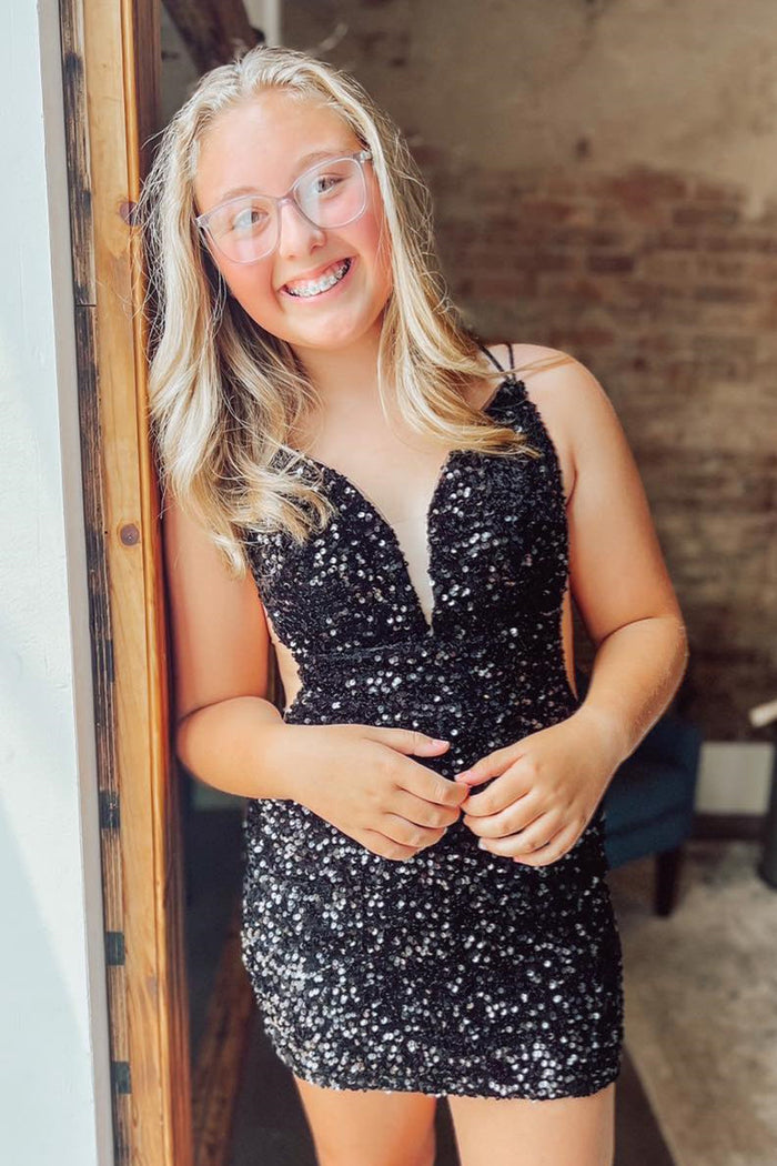 Black Straps V Neck Mirror-Cut Sequins Sheath Homecoming Dress