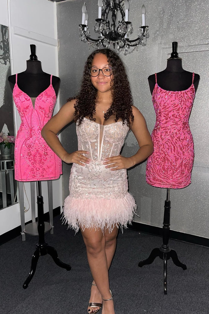 Pink Sequined Appliques Sheath Straps Homecoming Dress with Feathers