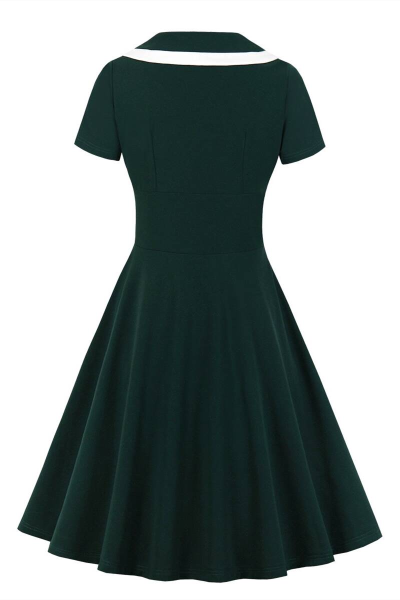 1950s vintage blue dress with white color blocked, features with short sleeves and v neckline.